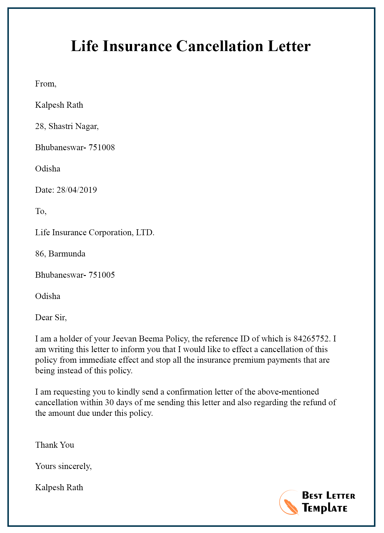 Sample letter format for surrender of life insur…